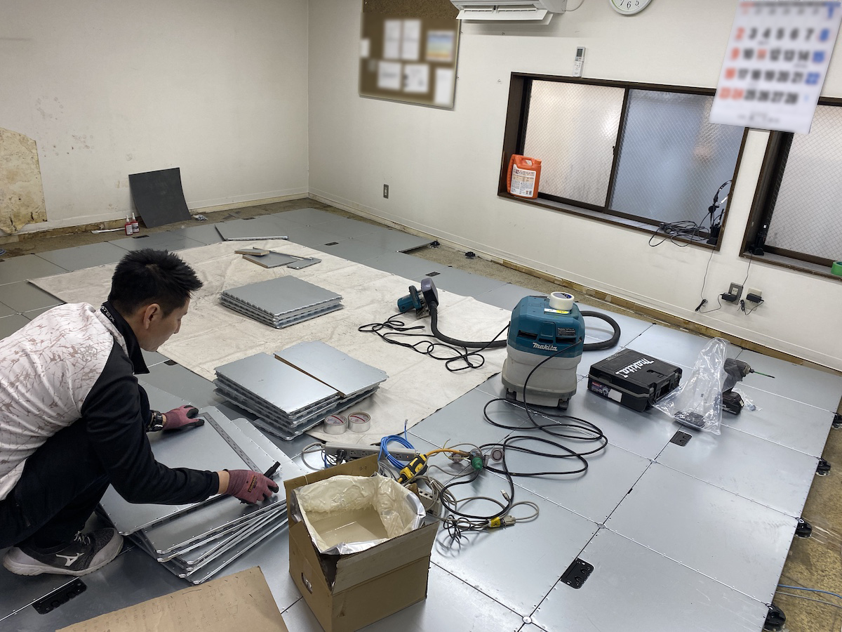2日目 | 既設OAフロア撤去 → ジャッキ調整式OAフロア敷設、壁下地補修 |